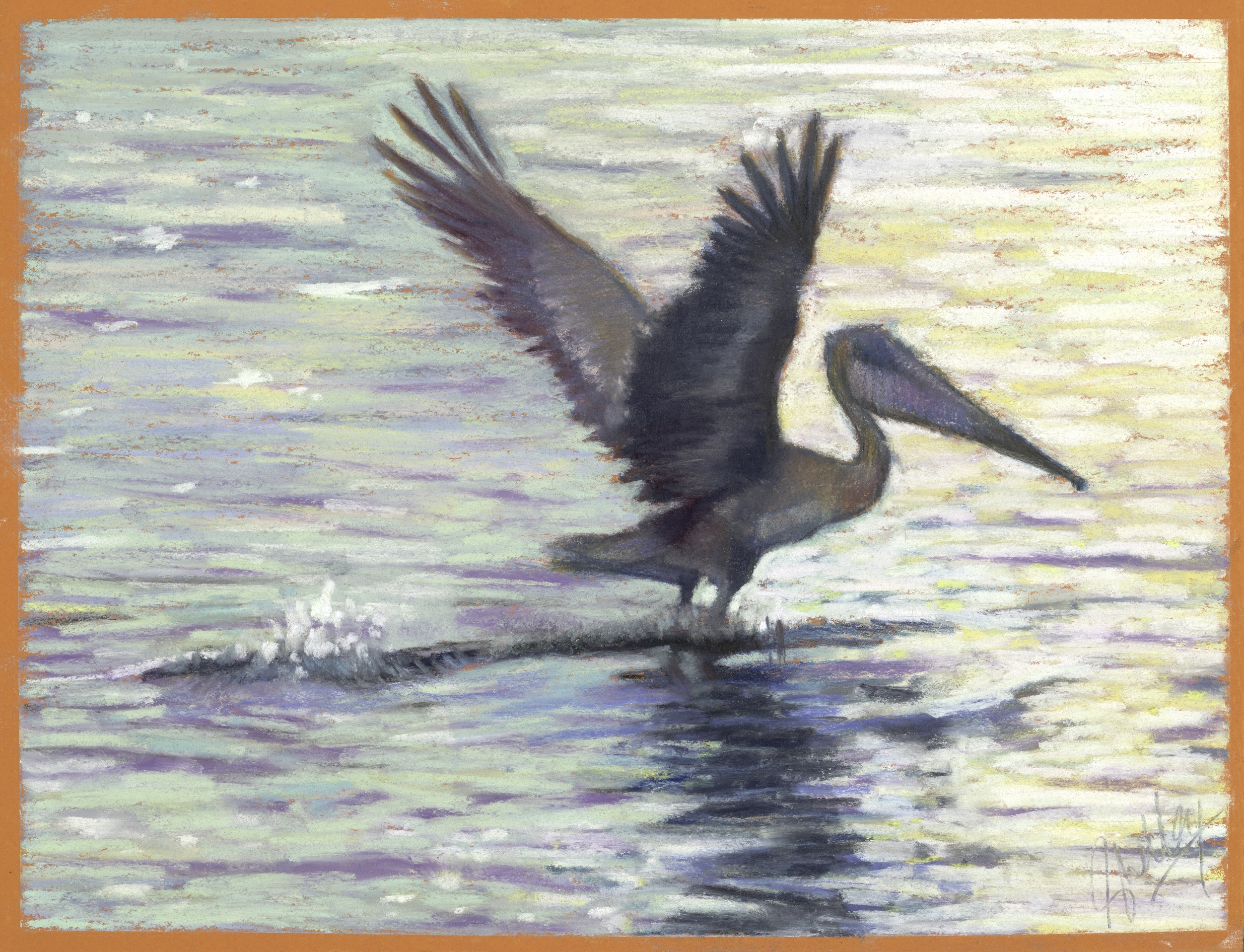 In the space between water and air, there is a subtle tension. Pelicans seem to occupy that energetic field in a way that alternates between grace, awkwardness and violence. I became fascinated with them when I first visited the Pacific coast almost 20 years ago. We don’t have pelicans where I come from, and they struck me as ancient, prehistoric creatures. The way they glide in a line over the waves, dive like a missile for fish, take off and land with such a tremendous splashing and flapping of wings is endlessly captivating. I swam near a flock of pelicans in Baja last year, and had the privilege of observing them up close while I floated in the water. There was a warm feeling of light glistening on the ocean all around us, and in our shared space gravity felt negotiable for a moment.